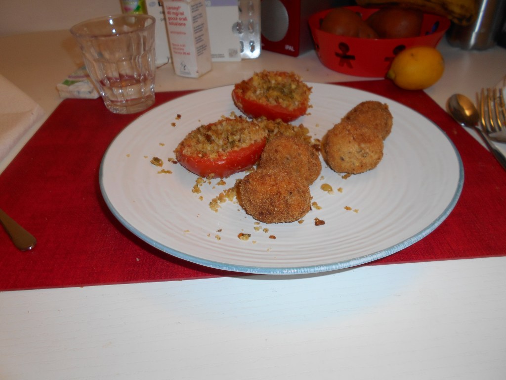 Faccio una scelta controcorrente e prendo 4 polpettine di salmone, tre chiacchere fritte e due pomodori gratinati.
