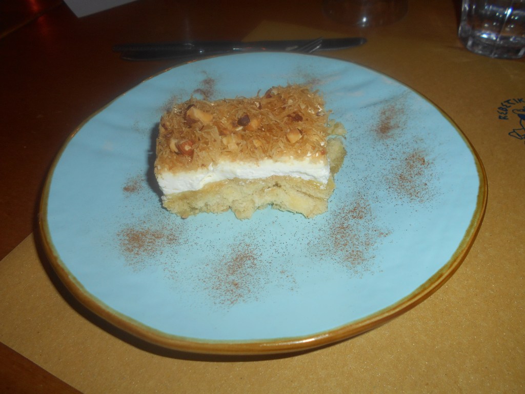 Il dolce è il piatto che mi ha convinto di meno di questa cena; si tratta di un semifreddo a base di pasta fillo, crema pasticcera, farina di frumento e Mastika.