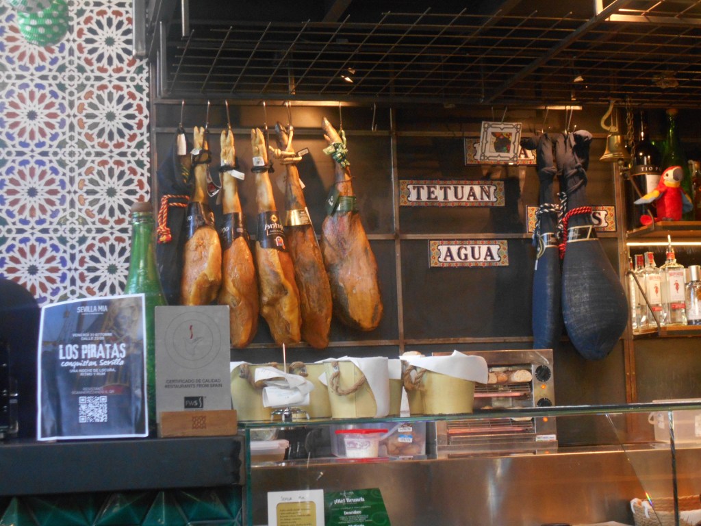 Il locale si presenta con dei bei prosciutti appesi al muro proprio come in Spagna.