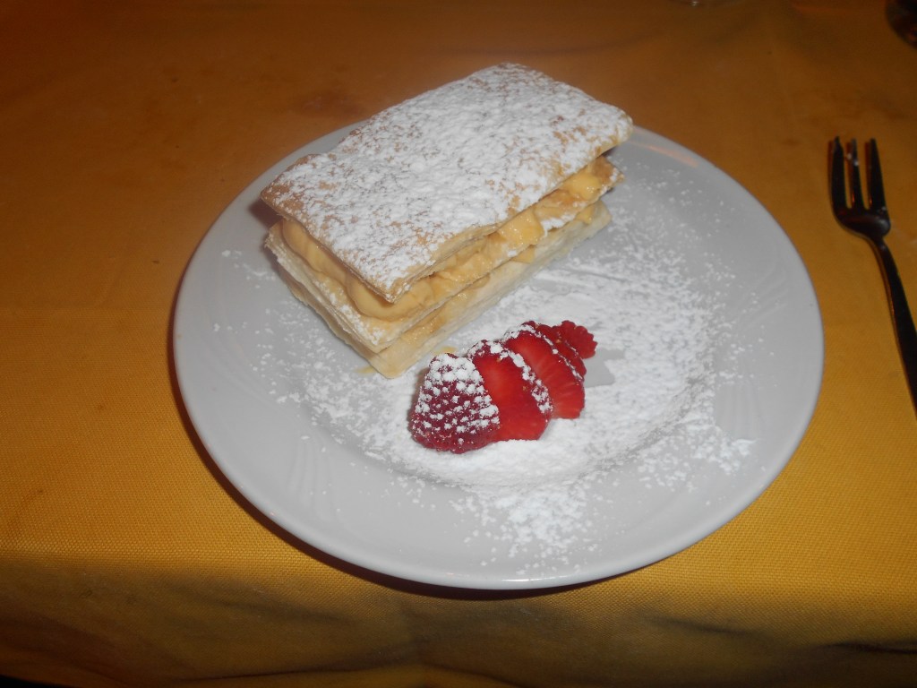 Quanto a me, essendo in vigore un“Niet!” di mia madre per questo tipo di dolce, prendo una millefoglie con fragole.