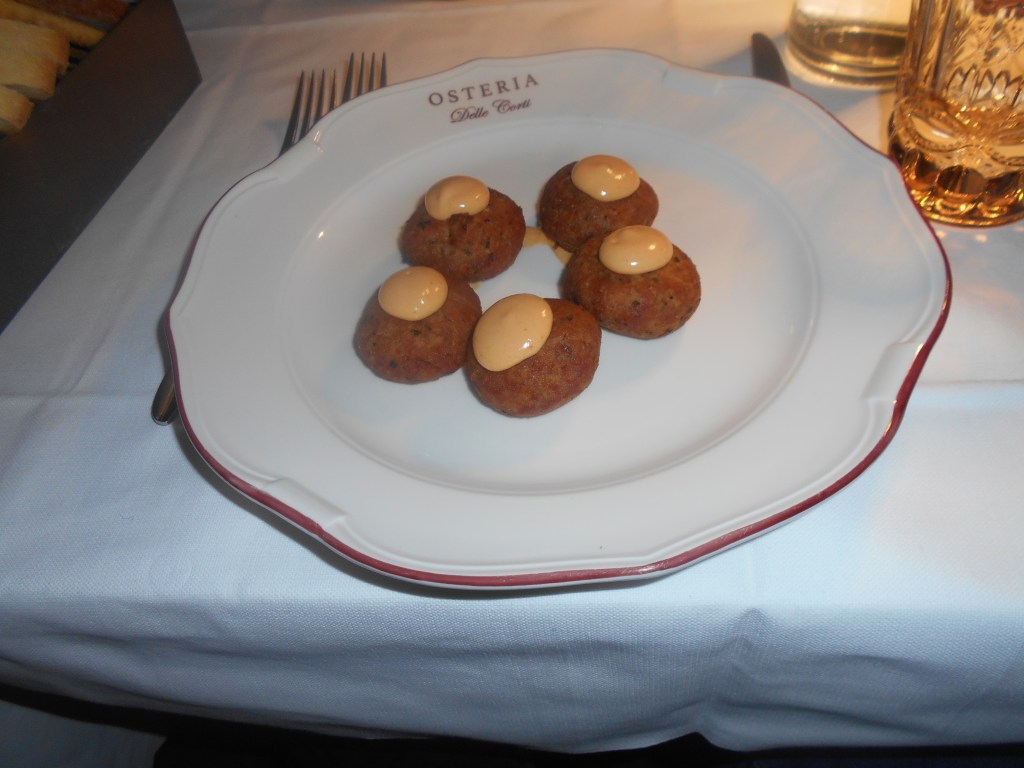 Venendo alla cena si comincia con dei mondeghili con una salsa di cui sinceramente, non ho capito l’origine.