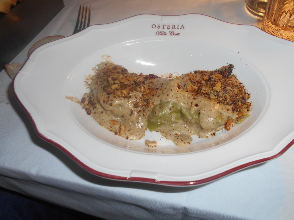 Qui si sale di livello rispetto all’antipasto, il sapore del sugo di noci è buonissimo e si bilancia bene con quello dell’altro protagonista del piatto: quantità giusta ma, vista la bontà, se ce ne fosse stato ancora lo avrei divorato!